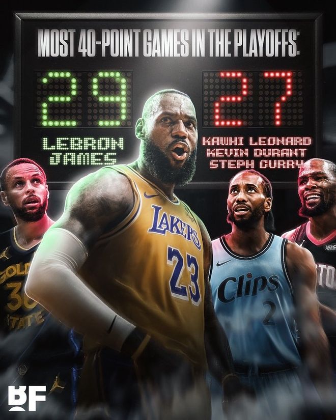 詹姆斯季后赛29次至少40分!库里、杜兰特、莱昂纳德共27次!